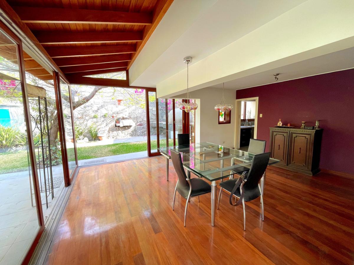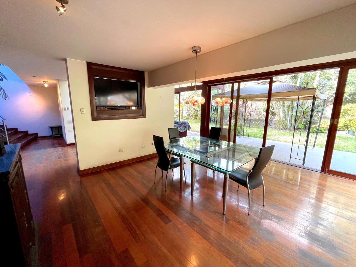 Ingresando encontramos una bonita sala de techos altos y un comedor con mamparas que se abren al 100% para unificarse con los patios y jardines.